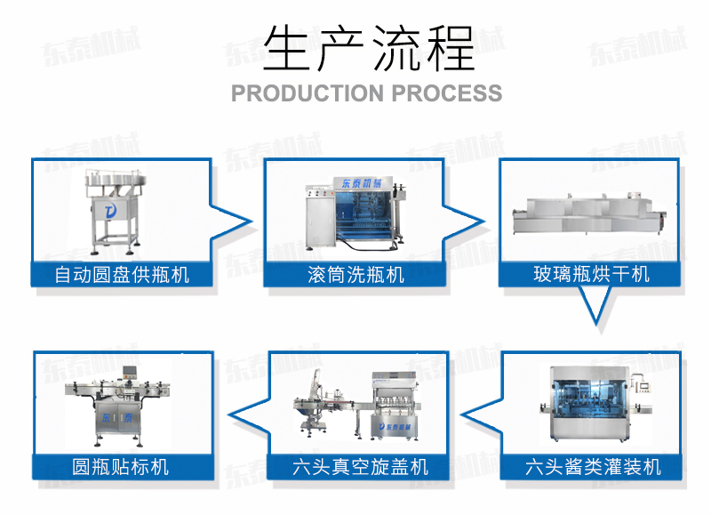 醬料灌裝生產(chǎn)線成套設(shè)備組成: 自動(dòng)供瓶機(jī)+全自動(dòng)滾筒洗瓶機(jī)+自動(dòng)六米烘干機(jī)+自動(dòng)收瓶機(jī)+全自動(dòng)六頭灌裝機(jī)自動(dòng)灌裝+全自動(dòng)提蓋機(jī)自動(dòng)理蓋、提蓋、掛蓋+六頭真空旋蓋機(jī)同時(shí)六個(gè)頭真空旋蓋+套標(biāo)機(jī)+收縮機(jī)+