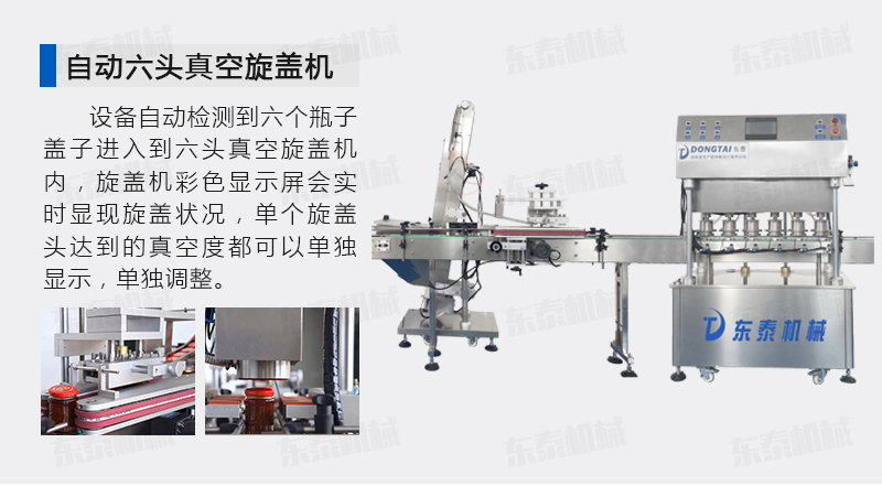 該直線式真空旋蓋機(jī)是東泰機(jī)械結(jié)合用戶使用的情況,摒棄了傳統(tǒng)轉(zhuǎn)盤式真空旋蓋機(jī)的弊端,研制開(kāi)發(fā)的設(shè)備,設(shè)備自動(dòng)檢測(cè)到六個(gè)瓶子蓋子進(jìn)入到六頭真空旋蓋機(jī)內(nèi),旋蓋機(jī)彩色顯示屏?xí)䦟?shí)時(shí)顯現(xiàn)旋蓋狀況,整機(jī)多點(diǎn)檢測(cè),當(dāng)進(jìn)口無(wú)瓶無(wú)蓋、出口堵塞、定位不準(zhǔn)、瓶身傾倒均自動(dòng)停機(jī)。單個(gè)旋蓋頭達(dá)到的真空度都可以單獨(dú)顯示,單獨(dú)調(diào)整!