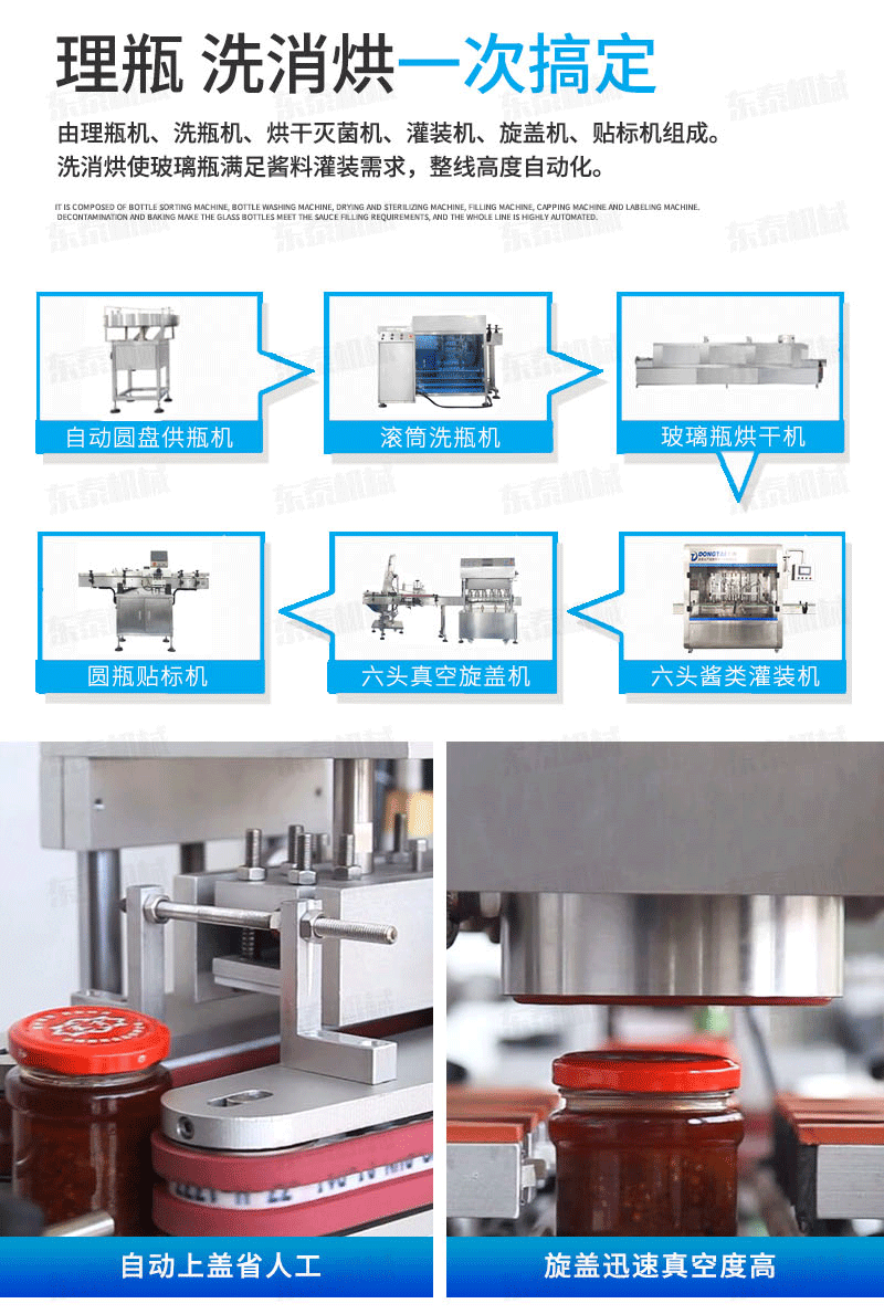 番茄醬灌裝旋蓋生產(chǎn)設(shè)備組成: 自動供瓶機+全自動滾筒洗瓶機+自動六米烘干機+自動收瓶機+全自動六頭灌裝機自動灌裝+全自動提蓋機自動理蓋、提蓋、掛蓋+六頭真空旋蓋機同時六個頭真空旋蓋+套標(biāo)機+收縮