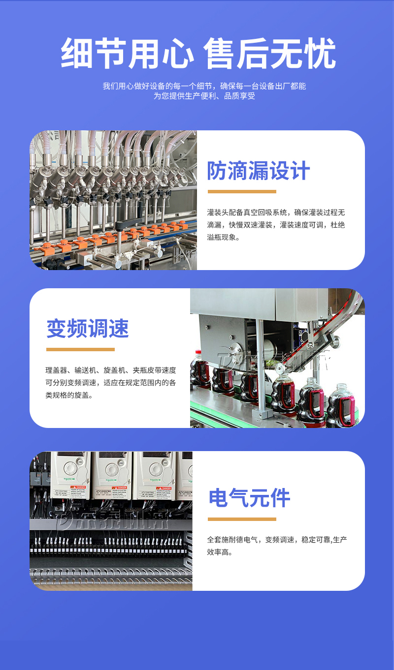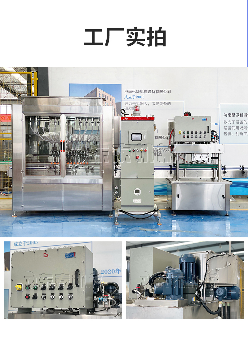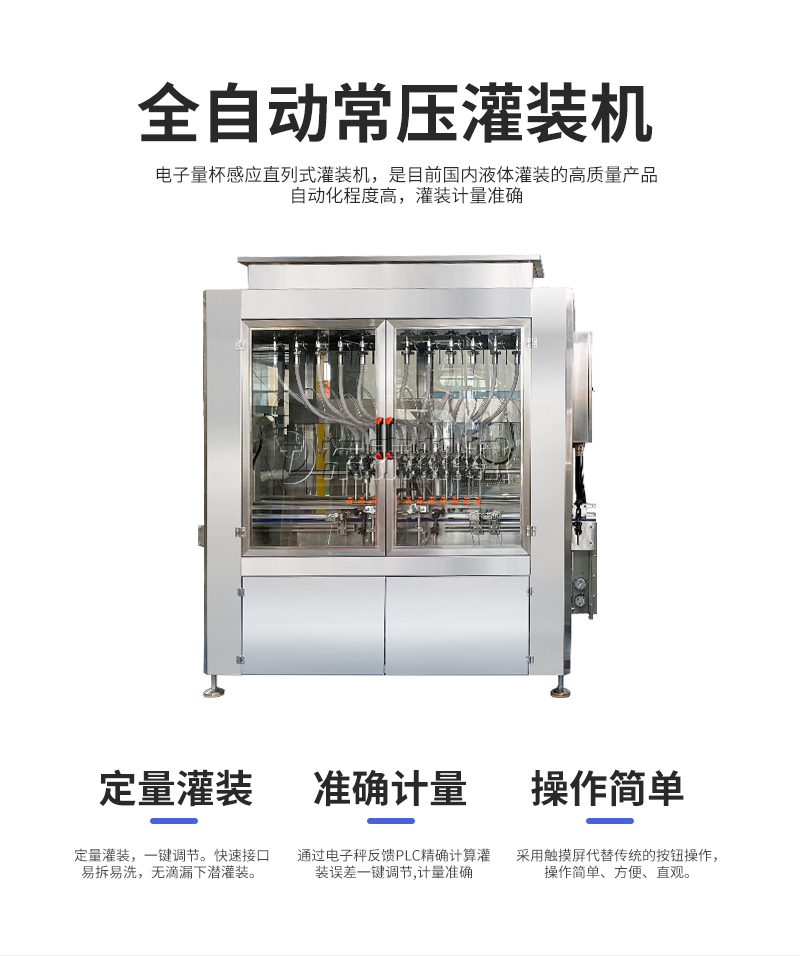 電子量杯感應(yīng)直列式灌裝機(jī),是目前國內(nèi)液體灌裝的高端產(chǎn)品,自動(dòng)化程度高,灌裝計(jì)量精確,適用于塑料瓶、玻璃瓶等各種幾何形狀的瓶型的不含氣體的酒水、飲料、調(diào)味品及其他溶液的定量灌裝。機(jī)器采用觸摸屏代替?zhèn)鹘y(tǒng)的按鈕操作,操作簡單、方便、直觀?萍己扛。機(jī)器灌裝計(jì)量可通過觸摸屏對(duì)灌裝時(shí)間的調(diào)整實(shí)現(xiàn)不同計(jì)量灌裝,方便操作者使用。