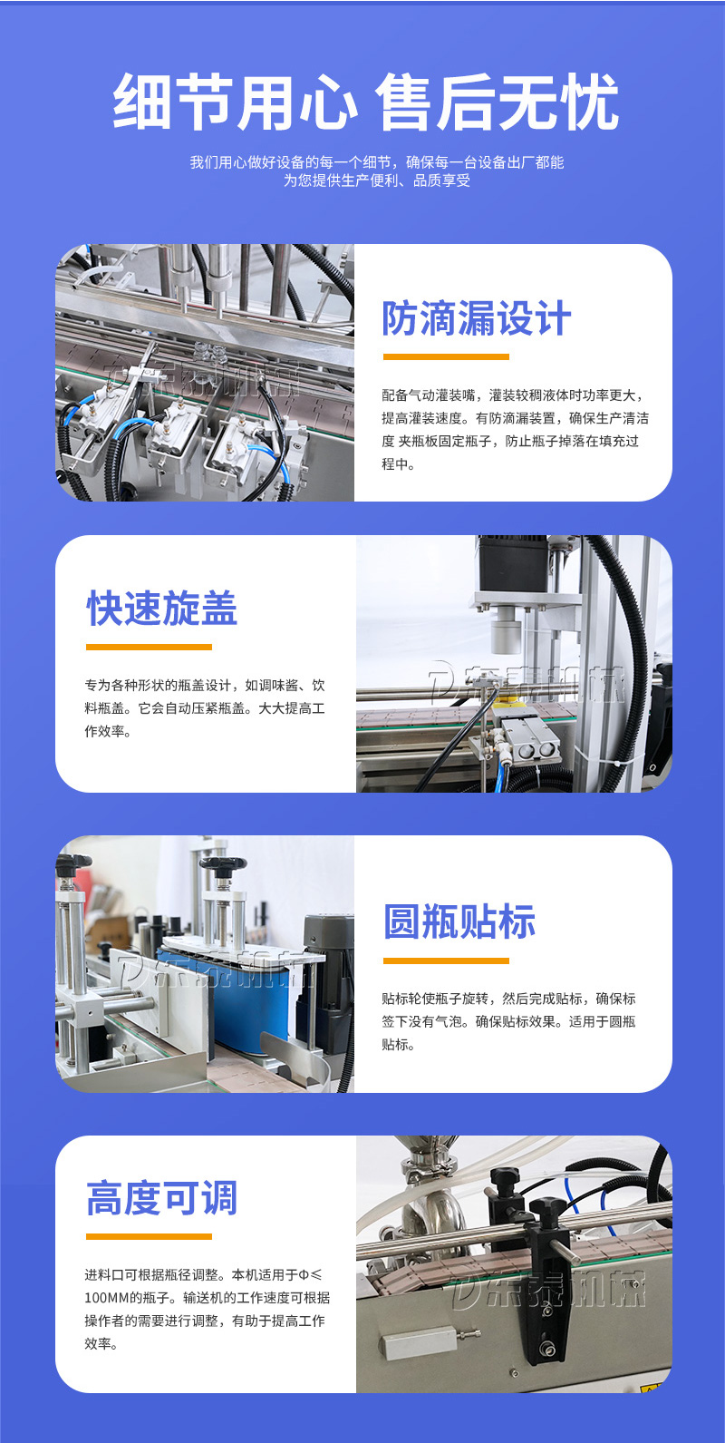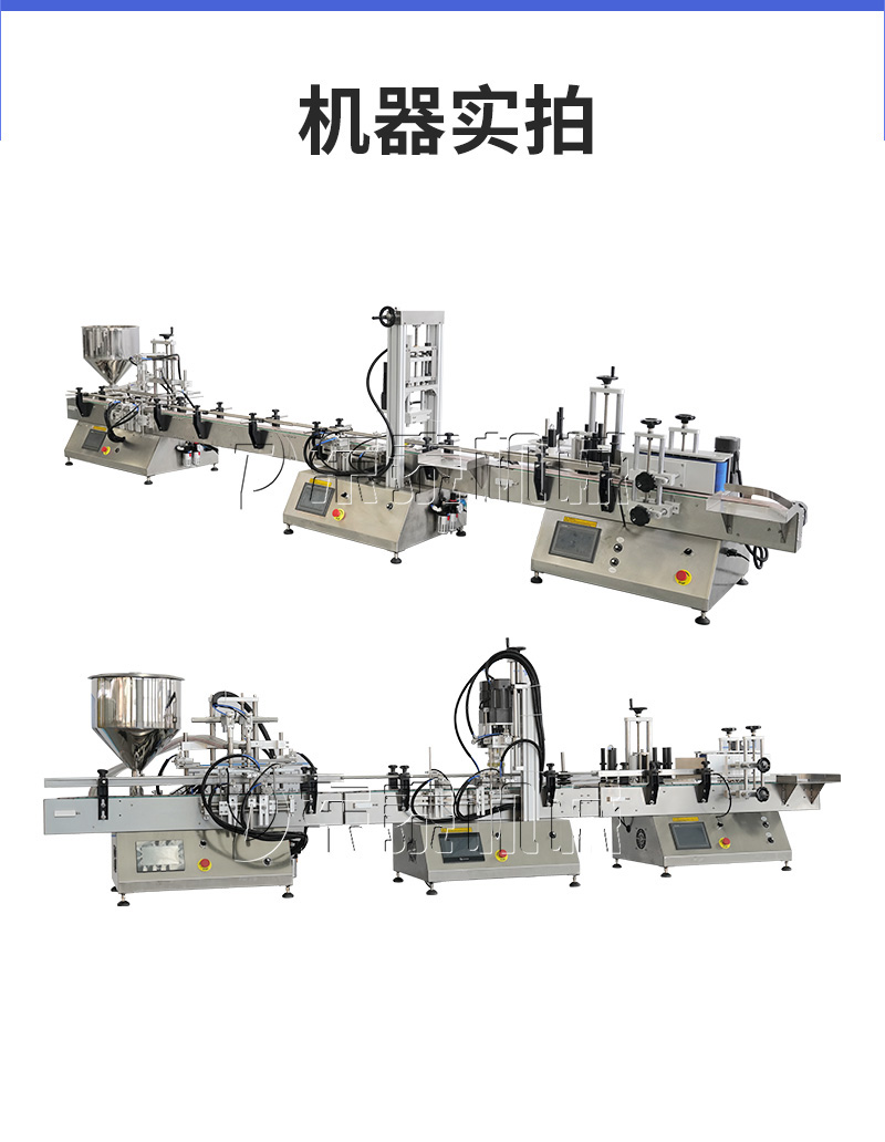產(chǎn)品說明:生產(chǎn)線根據(jù)灌裝范圍選擇型號,灌裝部分為雙頭下潛式灌裝機,適用于不同物料不同瓶子的灌裝,配備自動壓蓋機和圓瓶貼標機,可實現(xiàn)不同蓋子的旋蓋貼標工作。 本設備主要適用于食品、日;