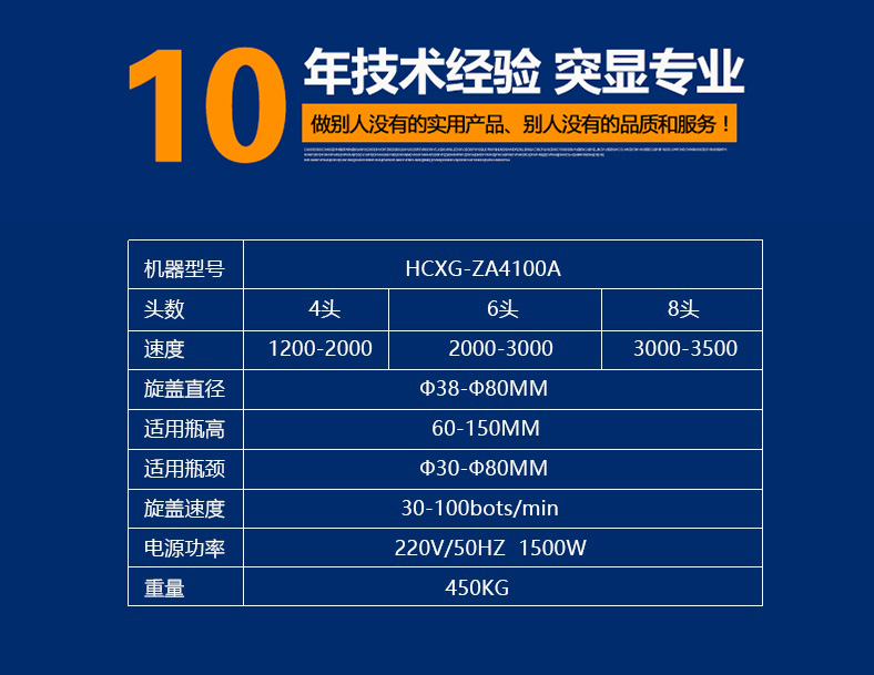 產(chǎn)品技術(shù)參數(shù) 機器型號:HCXG-ZA4100A 頭數(shù):2 速度:1200-2000次/時 旋蓋直徑:38-80mm 適用瓶高:60-150mm 適用瓶頸:30-80mm 旋蓋速度:30