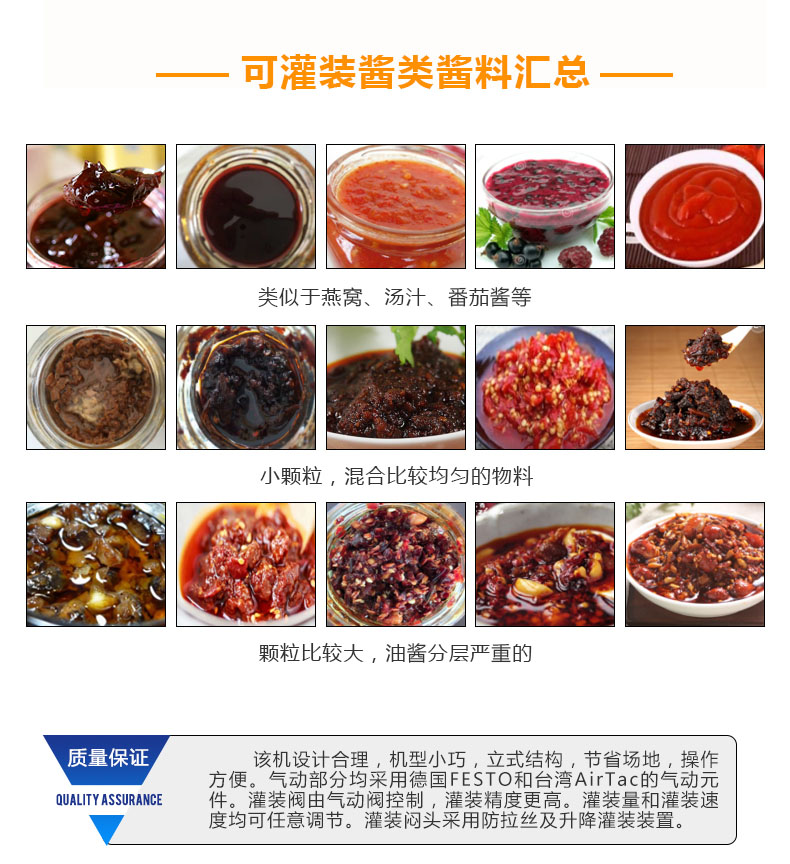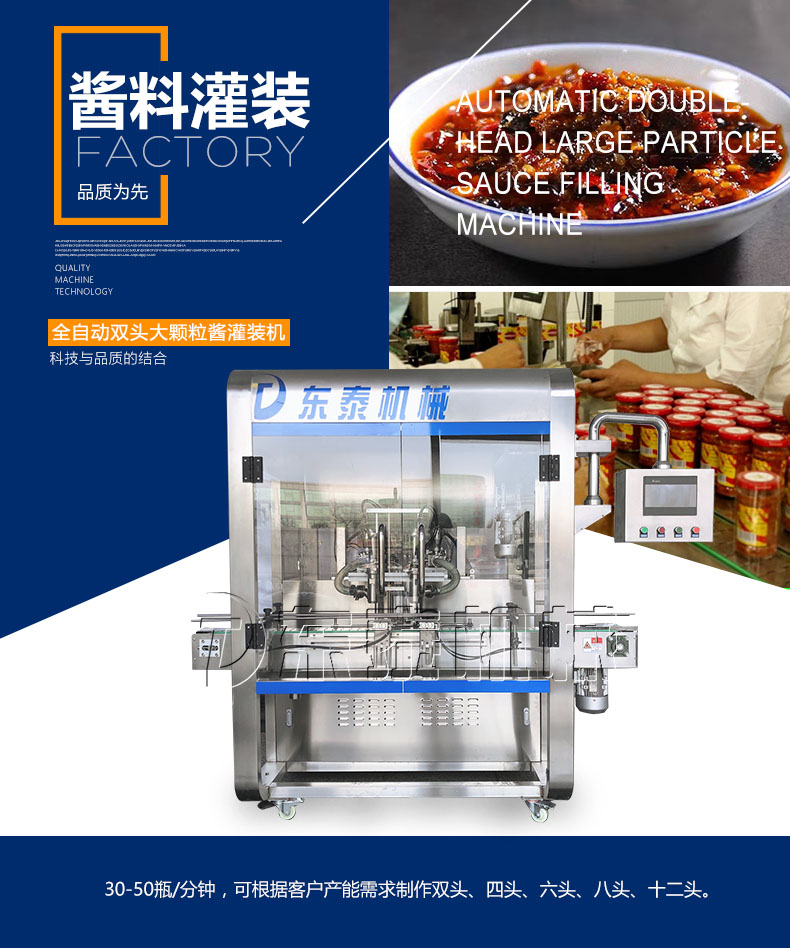 隨著機械技術(shù)的快速發(fā)展灌裝機的發(fā)展也是日新月異,使得其種類比較多。蘸醬在我國擁有悠久的歷史,在我國烹飪中占有著重要的地位,發(fā)展到現(xiàn)在在做菜和食品中也不可或缺,巨大的市場使得蘸醬灌裝機擁有巨大的市場,醬類廠家在引進(jìn)設(shè)備時都想采購到高效率、適合自己的蘸醬灌裝機械。人們對食品要求的提高使得醬類生產(chǎn)廠家迎來了較大的變格,安全衛(wèi)生是非常重要的標(biāo)準(zhǔn),因此對蘸醬灌裝機的選擇也更加的要求嚴(yán)格,許多傳統(tǒng)的機械已經(jīng)不能滿足企業(yè)高標(biāo)準(zhǔn)、高效率的要求。因此選擇一款適合的蘸醬灌裝機械產(chǎn)品顯得尤為重要。